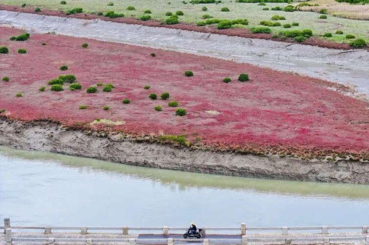 “天气一冷,它就红了,一大片的,比人工的植物带更美。”当地村民介绍,龙江两岸的这两条红丝带一样的南方碱蓬草并非人工栽种,而是自然生长的原生物种。