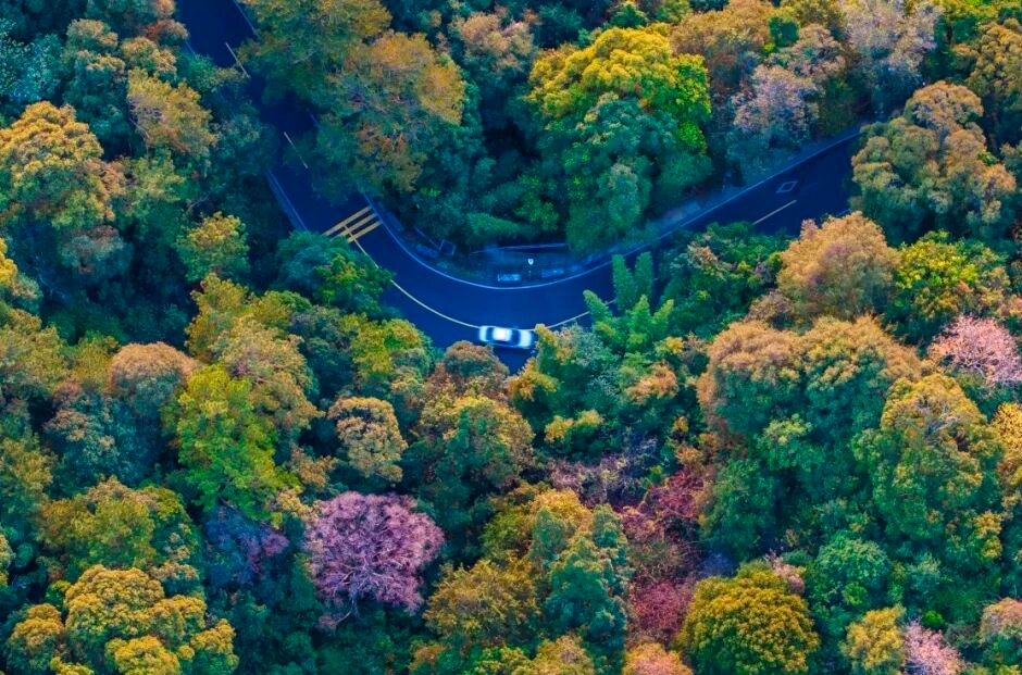 绿渐渐褪去,橘黄、深红、紫红层层叠加