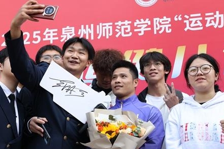 泉州师范学院学生和运动员李发彬合影。陈旭鹏 摄