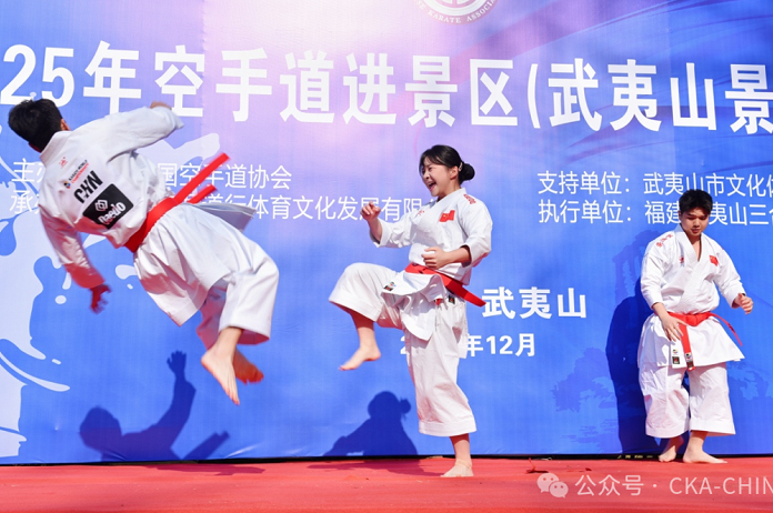 作为中国空手道协会推动空手道“三进”(进景区、进社区、进校园)的创新实践,本次活动阵容专业强劲。国家空手道型集训队主教练黄培华亲自带队,协会示范团成员郑乾驱、杨康威、叶珍羽、廖依琳等顶尖运动员齐聚武夷,凭借冠军影响力点燃现场热度,成为景区内一道亮眼的“体育明星风景线”。