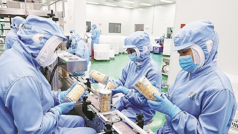 在淑先(福建)健康食品有限公司的现代化工厂内,智能化生产线高效运转,经过预处理、炖煮、灌装、灭菌等工序的鲜炖银耳在输送线上平稳流转。