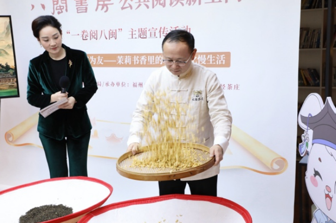 茶香与书香交相辉映。茶艺师行云流水般的冲泡演示,带领参与者品味茉莉花茶的清雅韵味;福州茉莉花茶窨制工艺代表性传承人严锦华,通过生动的实操演示,深入浅出地讲解了古法窨制的独特匠心,将抽象的知识转化为可感知、可互动的文化体验。同步开展的手工绒花制作体验,进一步丰富了阅读场景的互动维度,让市民在亲手创作中深化对传统美学文化的理解。