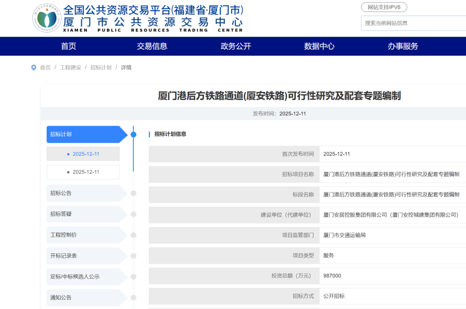 据厦门市公共资源交易中心消息,近日,厦门港后方铁路通道(厦安铁路)可行性研究及配套专题编制公开招标,预计招标内容为完成厦门港后方铁路通道(厦门至安溪铁路)可行性研究编制,以及可行性研究阶段所需各配套专题编制。