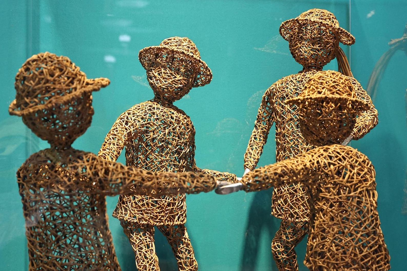 开馆首展锁定安溪藤铁非遗艺术。步入展厅,通透的玻璃展柜里,数十件藤铁工艺品在柔光下熠熠生辉:孔雀开屏,羽翼细密如真,仿佛下一秒就要振翅起舞;枝头花鸟,灵动摇曳,尽显自然意趣;作品《嬉戏》生动传神,四个头戴草帽的孩童手拉手围成圈,天真烂漫的模样跃然眼前。这些佳作既留存着传统手工的温润质感,又融入了现代审美的灵动创意,让人驻足忘返。