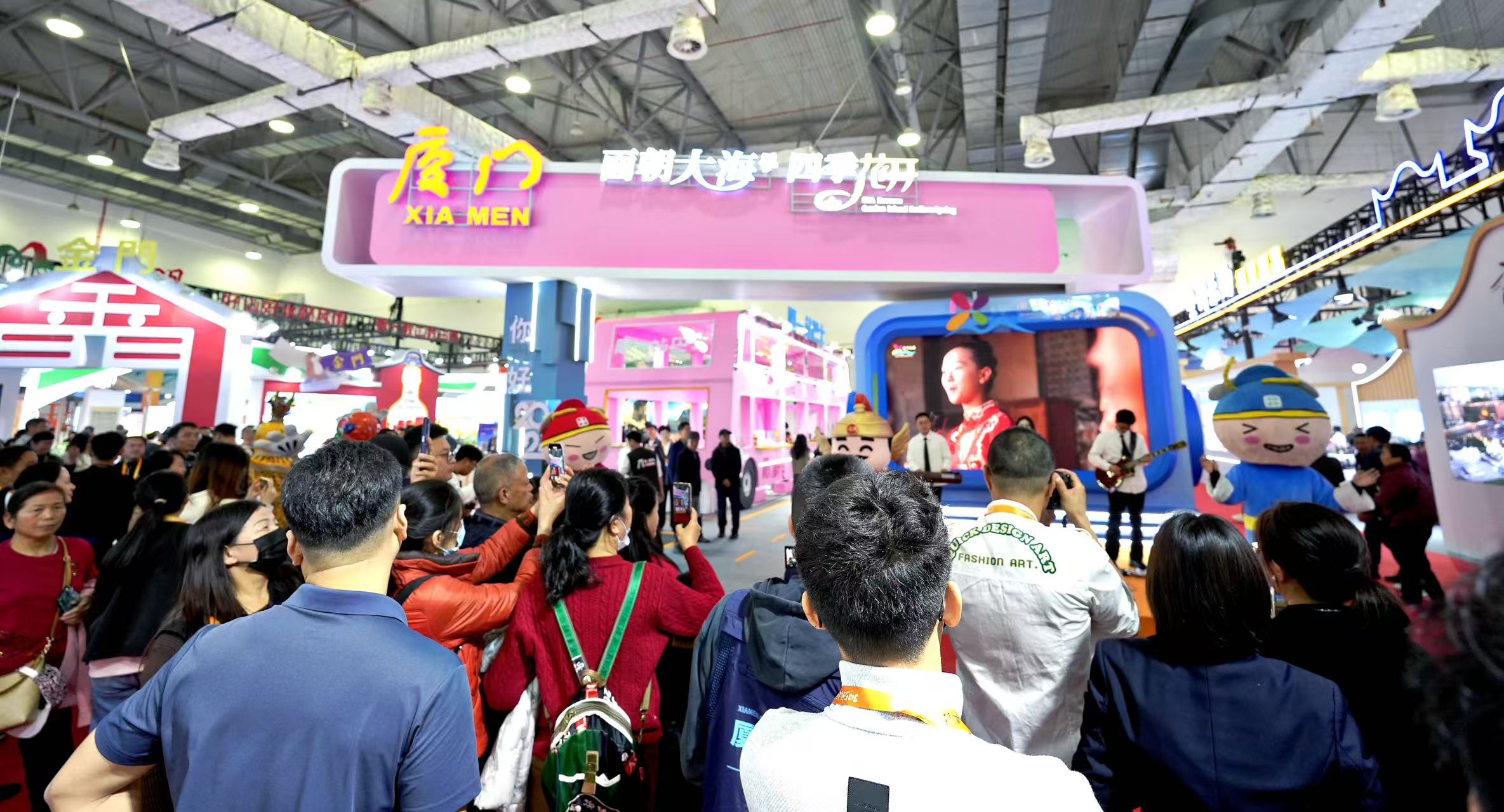 展区内场景丰富多元,精心设置海边沙滩打卡点、泡茶休闲区、在厦有礼文创产品展区、各地文旅局展区及洽谈咨询区,全方位满足观众体验与交流需求。沙滩打卡点还原了厦门滨海沙滩的浪漫风情,泡茶休闲区则展现了闽南特色生活方式,而十里长堤乐队的现场演绎,更将厦门的文艺气息与烟火气完美融合。