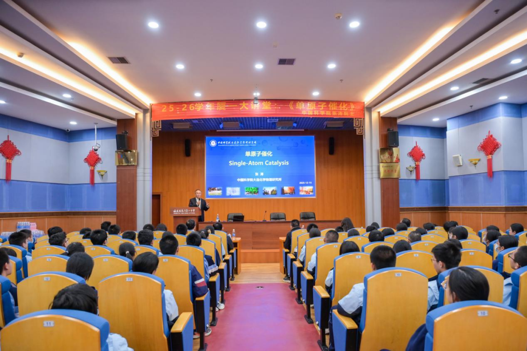 报告中,张涛院士从催化科学在国家航天航空、能源化工等领域的关键作用切入,结合丰富案例和数据,通俗易懂地阐述了“单原子催化”的基本原理、科学价值与广阔应用前景,将复杂的科学概念转化为学生可感可知的知识。在互动环节中,张涛院士耐心解答了同学们关于科学研究、学业发展等方面的疑问,并寄语同学们“热爱科学,热爱化学,为祖国强盛发奋学习”。现场气氛热烈、掌声不断。
