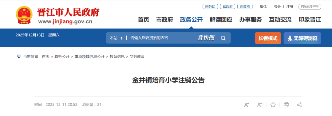 晋江市金井镇培育小学依据《事业单位登记管理暂行条例》,经举办单位同意,拟向事业单位登记管理机关申请注销登记,其债权债务将由晋江市金井镇中心学校承接。