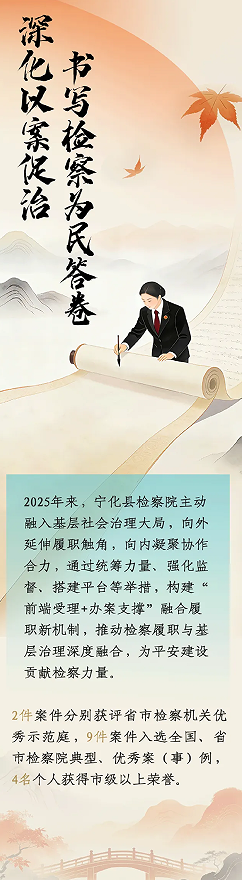 检察品牌,是司法为民初心的时代答卷,是检察工作现代化的鲜活实践。2025年以来,三明市检察机关锚定“高质效办好每一个案件”目标,一体抓实“三个管理”,强化品牌润心育人作用,激发基层创新活力,推动品牌建设从“有形覆盖”向“有效赋能”跃升,促进检察工作与时代脉搏同频共振,为高质量发展注入更强劲的检察动能。三明检察微信公众号开设“一院一品”专栏,本期带您走进宁化县检察院,聆听品牌背后的法治故事,见证理念如何落地为实效,书写“与时代同频、与人民同心”的法治新篇章。