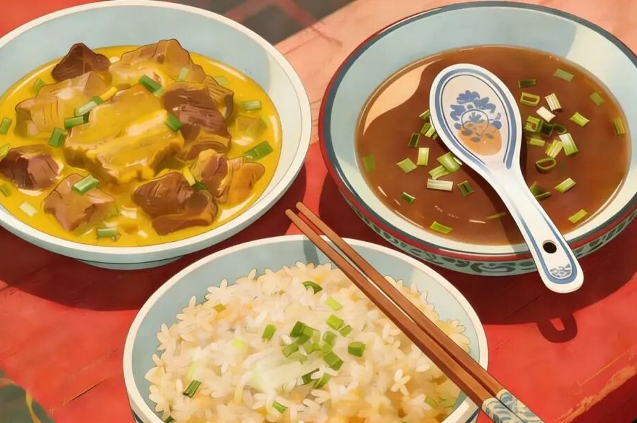 咖喱牛排配咸饭,再加上一碗热汤。(AI制图)