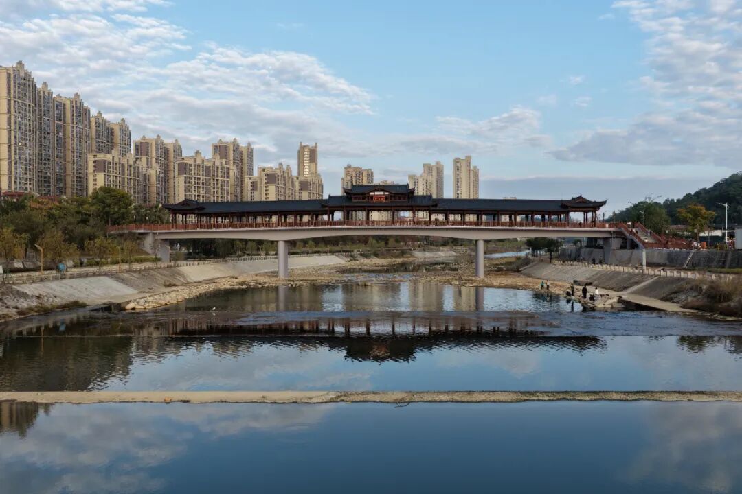 据悉,该项目由宁德市城建集团权属企业闽东地产公司承接建设,于2025年2月开工。项目位于蕉城区金涵畲族乡,连接溪口村及上兰村,桥梁总长128米,其中主桥长92米、桥面宽8米,主桥为混凝土现浇连续刚构桥,上部廊亭为木质榫卯结构。