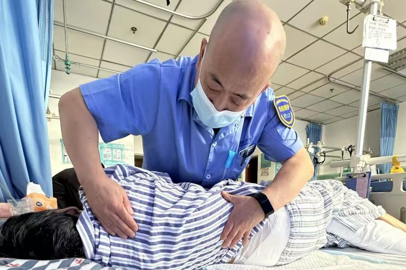 免陪照护病区护工为病人翻身擦洗。