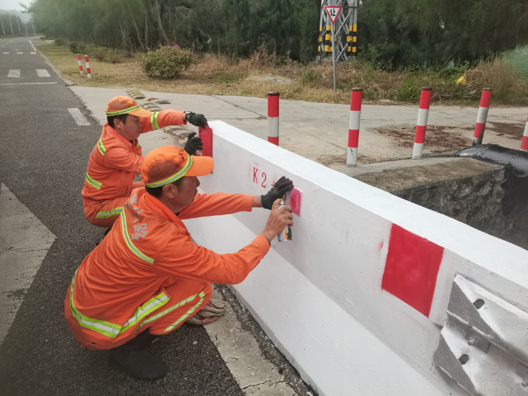 施工现场,安全布控有序摆放,养护人员化身“艺术家”拿着喷漆绘制醒目的交通标志,同时对老旧破损的道口桩进行更换。那些曾经模糊不清、难以辨认的标志,或是因风雨侵蚀而残缺不全的标牌,正被一块块崭新、醒目的新标牌所取代。更新后的交通标志标线色彩鲜艳、清晰明了,显著提升国道安全引导能力。