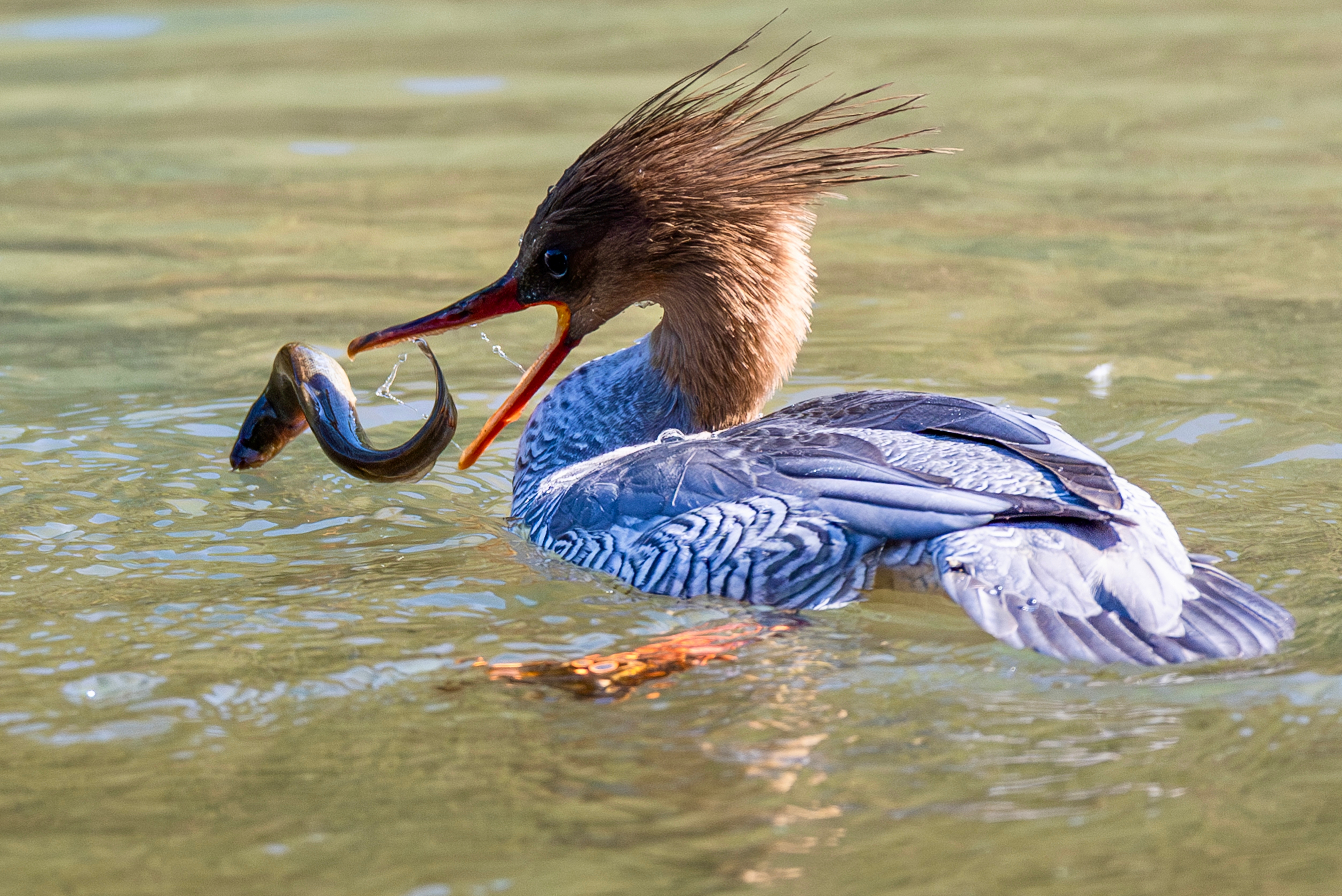 中华秋沙鸭在大樟溪水面上觅食。