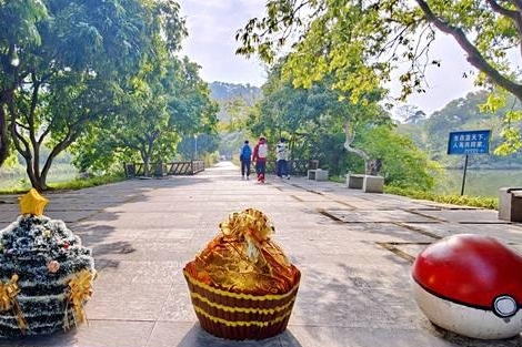 学生们将石墩装扮成“精灵球”“费列罗巧克力”“圣诞树”等造型