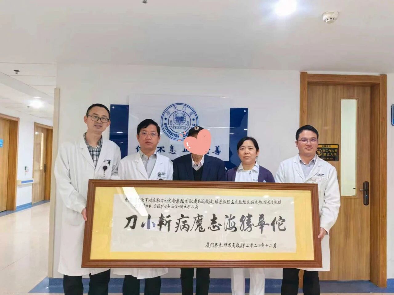 术后7个月,韦老师亲手捧着写有“刀小斩病魔,志海胜华佗!”的牌匾回到医院,激动地握住医护人员的手:“感谢你们让我重返讲台,重拾书法老师的风采!”