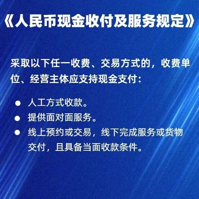 《规定》明确,采取以下任一收费、交易方式的,收费单位、经营主体应支持现金支付:人工方式收款;提供面对面服务;线上预约或交易,线下完成服务或货物交付,且具备当面收款条件。