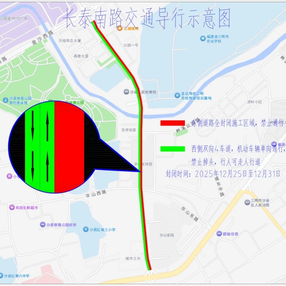 沙县区城区主次干道管网改造建设项目-长泰南路提升改造项目因东侧道路即将加铺沥青,预计对长泰南路东侧道路全路段封闭施工,封闭路段从新城中路金三角红绿灯处至金沙西路商会大厦红绿灯处,封闭时间为2025年12月25日至2025年12月31日。