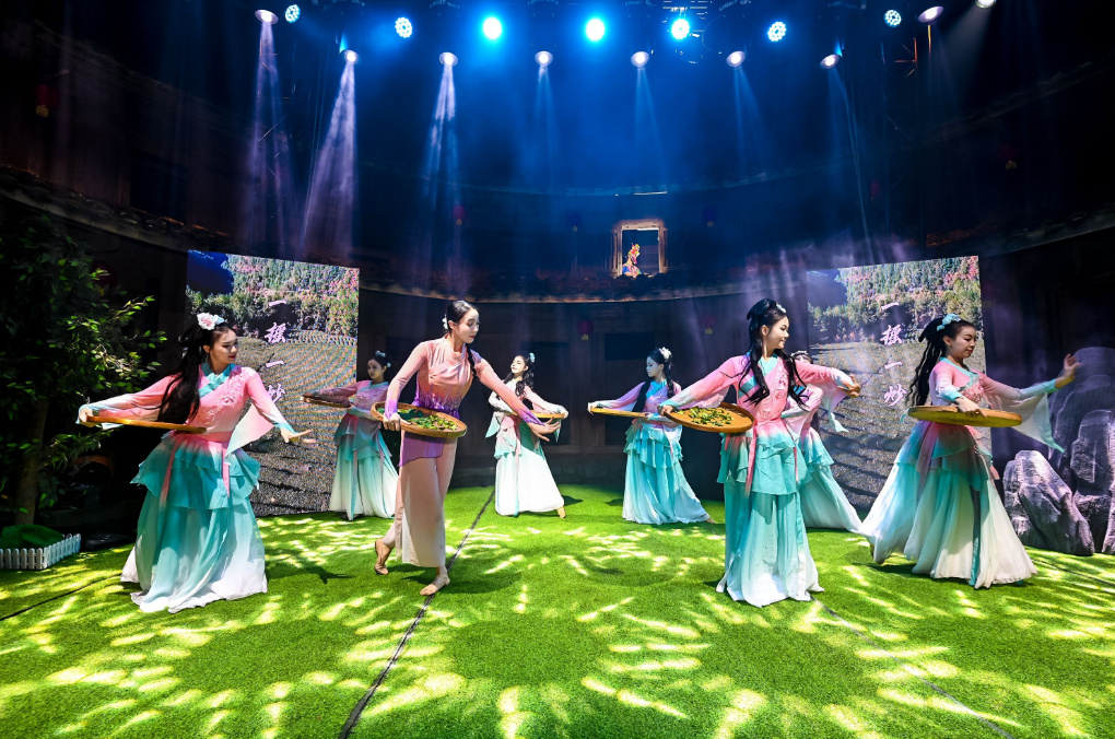 夜幕降临后,灯光次第亮起,雨伞楼在光影流转间焕新颜。演出以“序・光影叙事”开篇,3D投影配合悠扬的钢琴旋律破开时空界限,金观音茶仙登场引路,将观众带入如梦似幻的“仙境”。随后,“檐上清音”“古道茶韵”“云腴问仙”等章节依次铺展,活动巧妙将高车乡的茶史、民俗与传说融入歌舞及情景剧表演中,生动诠释“观音醉客”的独特茶文化魅力。尾声“伞映千秋”环节,流光勾勒出土楼巍峨的轮廓,孔明灯冉冉升空,承载着人们对团圆美好的祈愿缓缓飘向夜空。