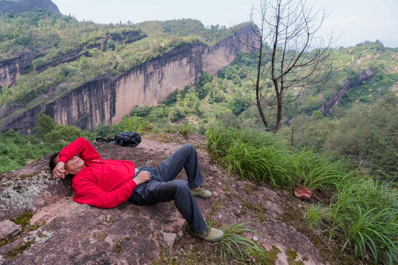 ▲2025年5月1日,位于武夷山景区中心的岩茶核心产区,采茶客躺在岩石上午休。