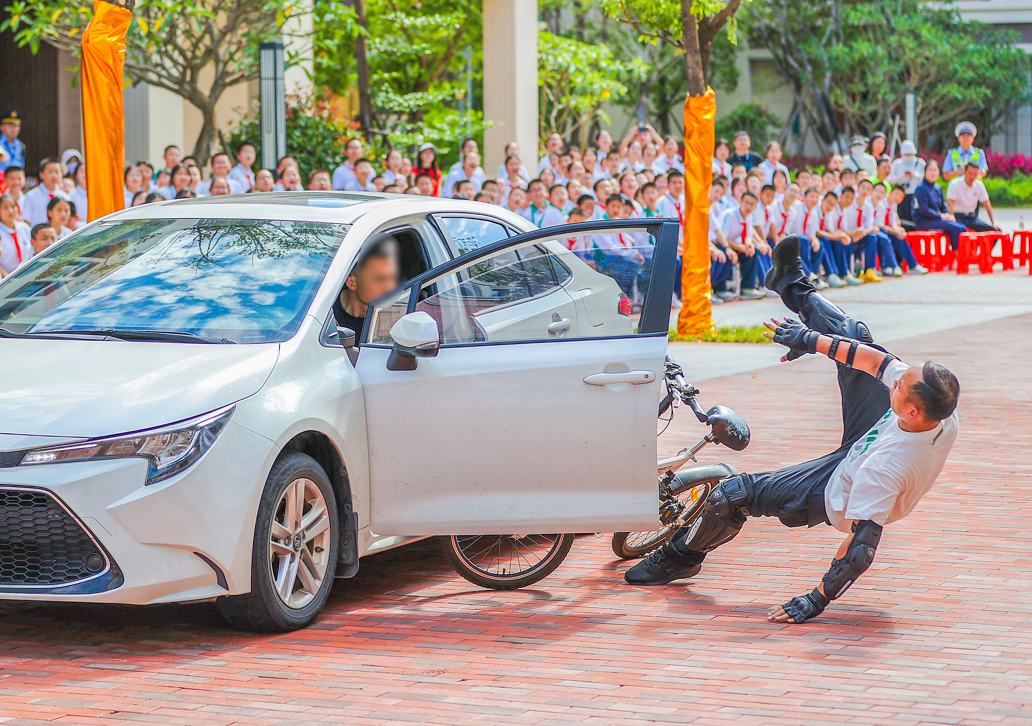 ▲2025年5月16日,晋江一中池店校区,在交通安全进校园活动中,工作人员情景模拟“开门杀”。
