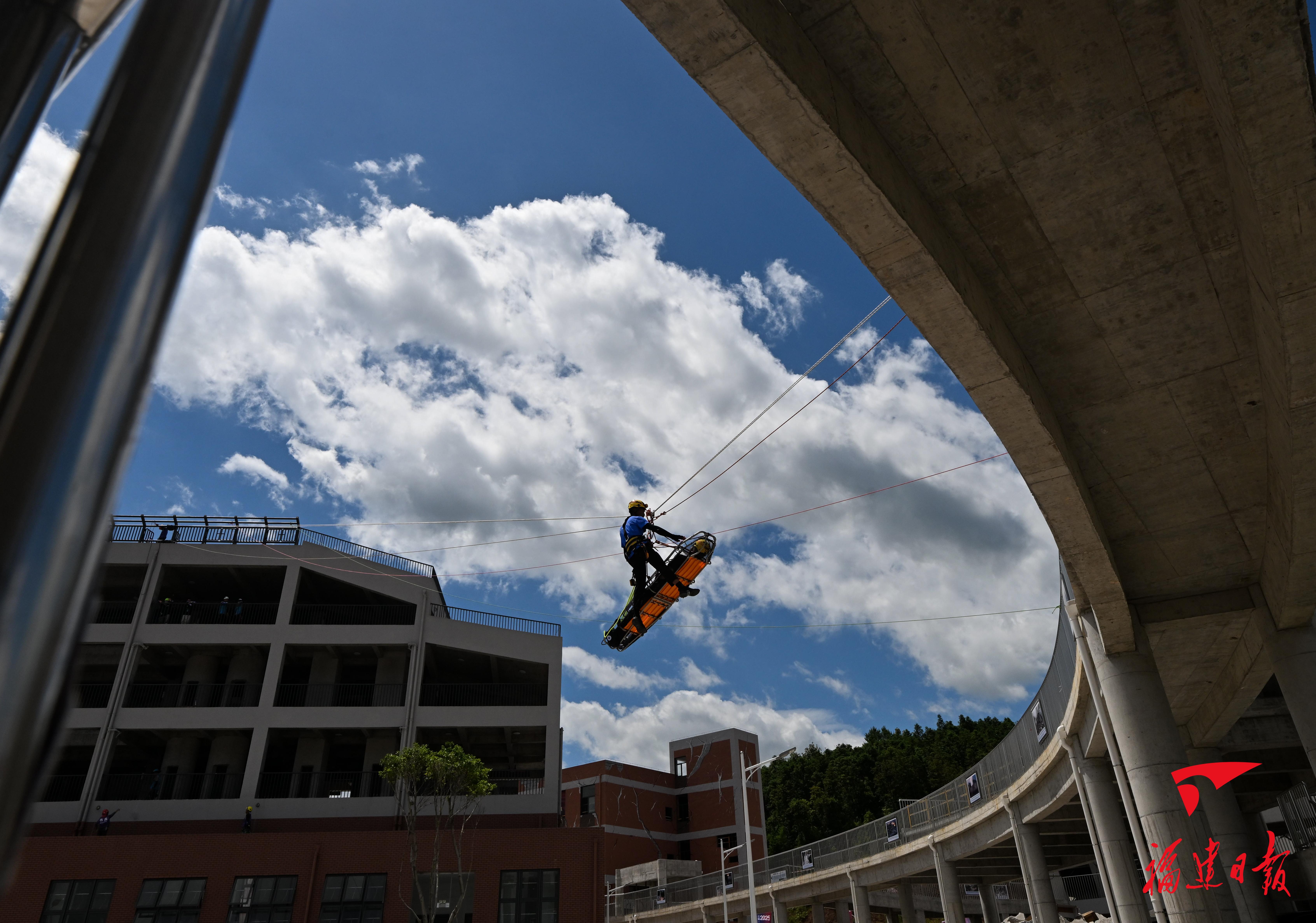 ▲2025年6月17日,世界绳索与水域救援技术交流赛在沙县区举行,参赛选手在进行高空绳索救援赛。