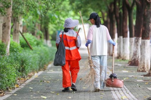 ▲64岁的林清绸在晋江做环卫工,2025年暑假期间,13岁的孙女吴思桐利用暑假时间经常帮外婆扫地。婆孙两人一起下班的背影成为了晋江马路上最动人的画面。