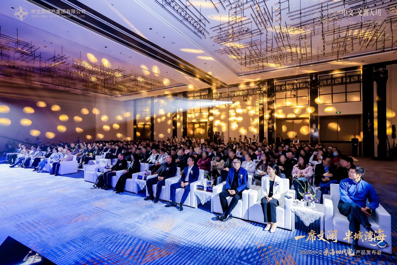 发布会以极光幕影交织璀璨灯光,构建出沉浸式的“文澜艺境”。各界嘉宾与媒体齐聚,共同见证了中交亲海四代宅的正式亮相。