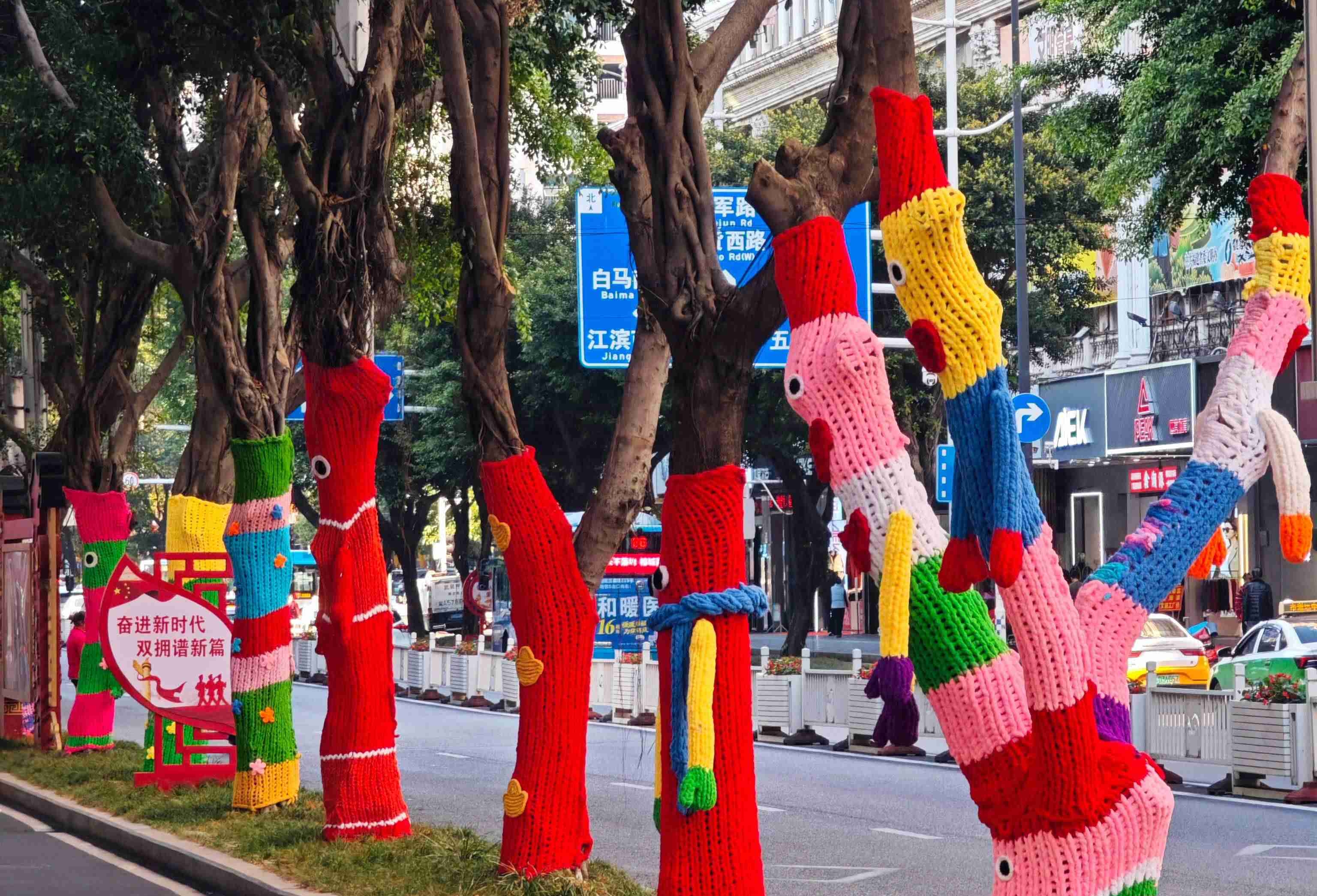 街头的部分行道树迎来了特别装扮