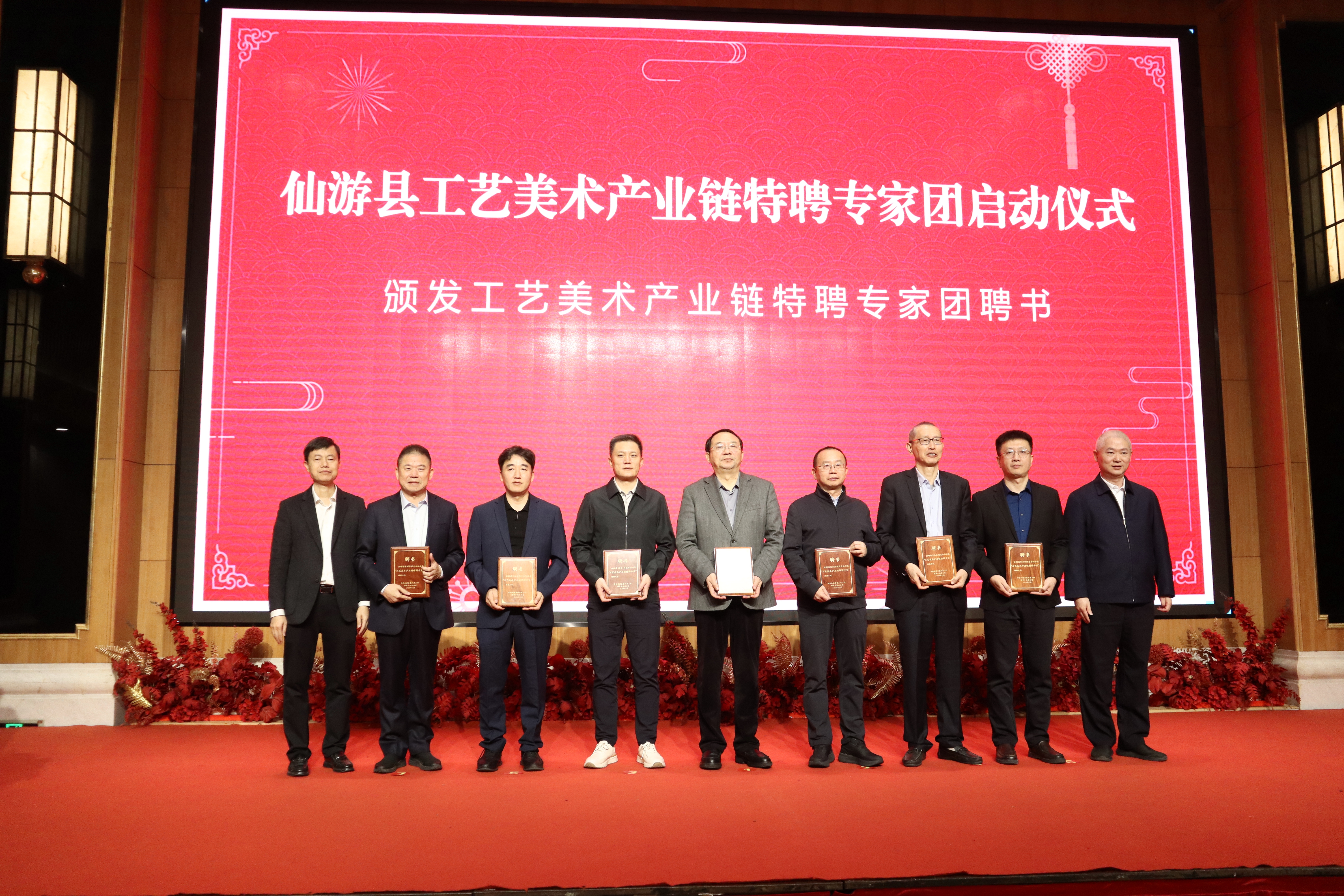 仪式上,为仙游县工艺美术产业链特聘专家团成员颁发聘书。他们分别是:海南省人大常委会委员、海南大学原副校长傅国华;故宫博物院研究馆员、中南林业科技大学传统家具创新研究中心副主任周京南;福州大学厦门工艺美术学院副院长、教授张健;莆田市工艺美术产业专家政策组组长、市工艺美术协会会长王加林;中国建筑装饰协会高级室内建筑师、古典印象装饰设计(北京)有限公司总设计师常江波;莆田学院管理学院人力资源管理系副主任林亚鹏;中国工艺美术大师、国家级非物质文化遗产“仙作”代表性传承人、全国轻工行业“大国工匠”黄福华;省工艺美术学会会长黄宝庆;中国热带农业科学院热带生物技术研究所研究员、博士戴好富。其中,黄福华担任特聘专家团团长,王加林任执行副团长。