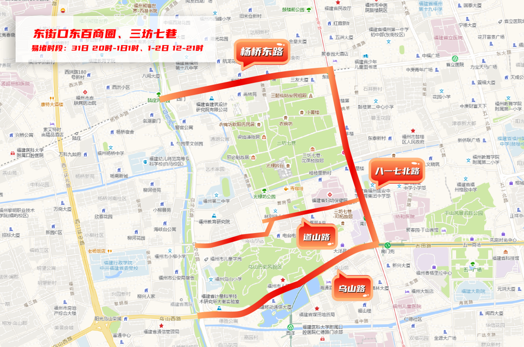 今年元旦假期为1月1日-3日(周四-周六),1月4日(周日)则调整为工作日。从近年元旦节出行规律来看,12月31日(节前一天)18时-1月1日1时跨年夜活动期间东街口东百商圈,西二环“苏万宝”商圈,浦上大道爱琴海、万达、烟台山,长乐路世欧王庄等重点商圈景区周边道路极易发生拥堵。1月1日-3日(节日期间)三坊七巷、烟台山、鼓山等热门景区周边道路较易发生拥堵。