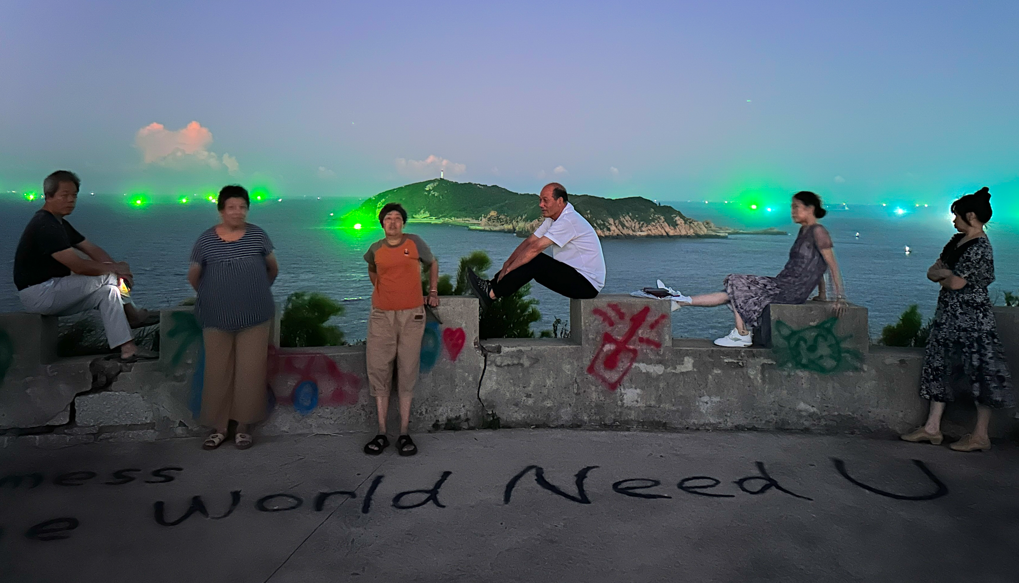 ▲2025年8月16日晚,连江苔菉镇村民在北茭鼻地质公园里乘凉。海面上亮着当地捕捉鱿鱼的绿灯,地上写着“World Need U"。这里是连江的热门旅游景点,也是当地居民家门旁的公园。