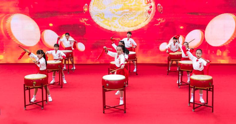 活动在气势恢宏的舞龙表演《金龙飞舞》中拉开帷幕,灵动腾跃的龙身尽显少年朝气;紧接着,大鼓社团《龙腾中国》奏响激昂鼓点,传递对祖国的美好祝愿,迅速点燃现场氛围。