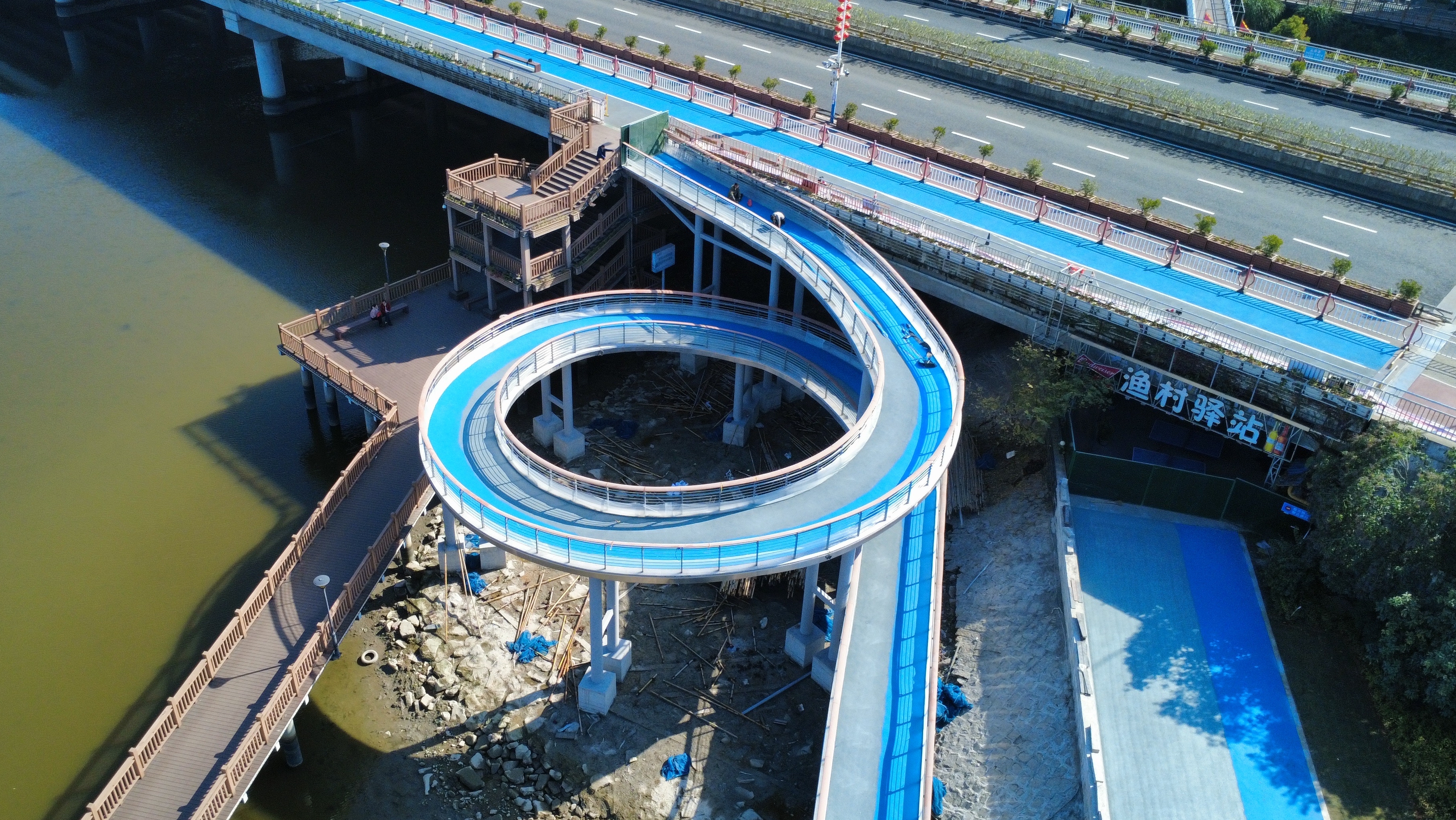 12月30日,记者来到位于市区金马大桥南侧与南岸公园二期连接处的旋转步道项目建设现场,在航拍镜头下可以看到,旋转步道外观成形,工人正在进行收尾施工。