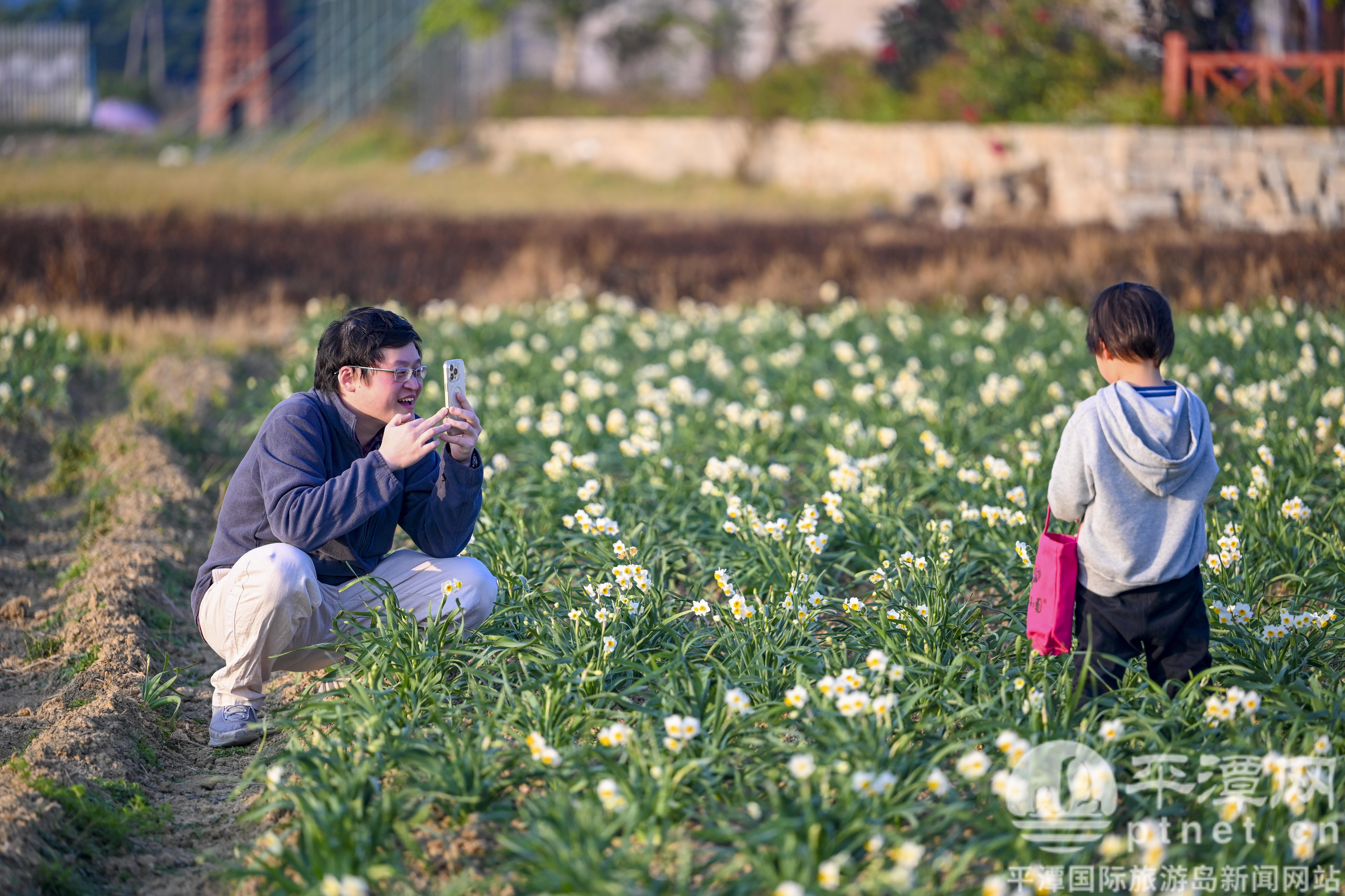 走在田野间,一行行水仙花绿意葱茏,白色花卉迎风摇曳。部分闻香而来的市民游客在花田间穿行,手捧白瓣黄芯的水仙花,脸上洋溢着笑容。“这些水仙花是属于平潭人独有的快乐,既能闻到花香,又能享受到日光浴,感觉很棒,拿回家让家里飘满水仙花香。”市民俞琴说。