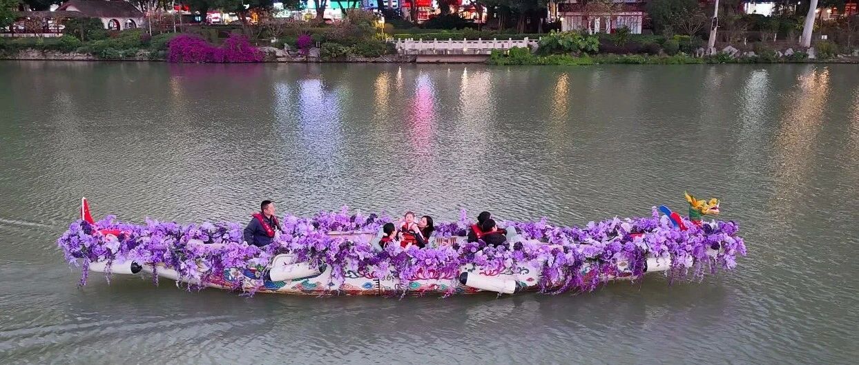 此次亮相西湖码头的龙舟花船,船身四周环绕簇拥着紫色花朵。“花船的花艺设计以紫藤花为原型,既与航线文化相契合,也能带领游客更好感受闽都内河文化魅力。”工作人员说。