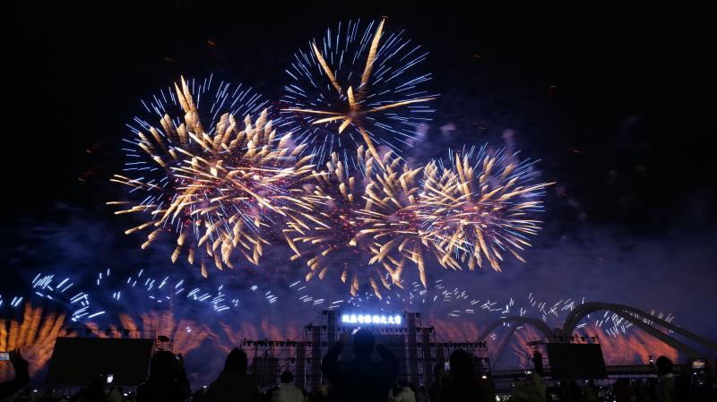 七彩祥云、蓝色眼泪、金色狂想……焰火燃放现场,各色焰火依次在夜空绽放,焰火爆破声层层递进,形成长达800米的壮观表演阵线,舞台上主题音乐、表演轮番燃爆现场,人群中鼎沸的惊叹与欢呼声一浪高过一浪,光影映照着人们的笑脸,点燃了人们心中对未来无限美好的期许。