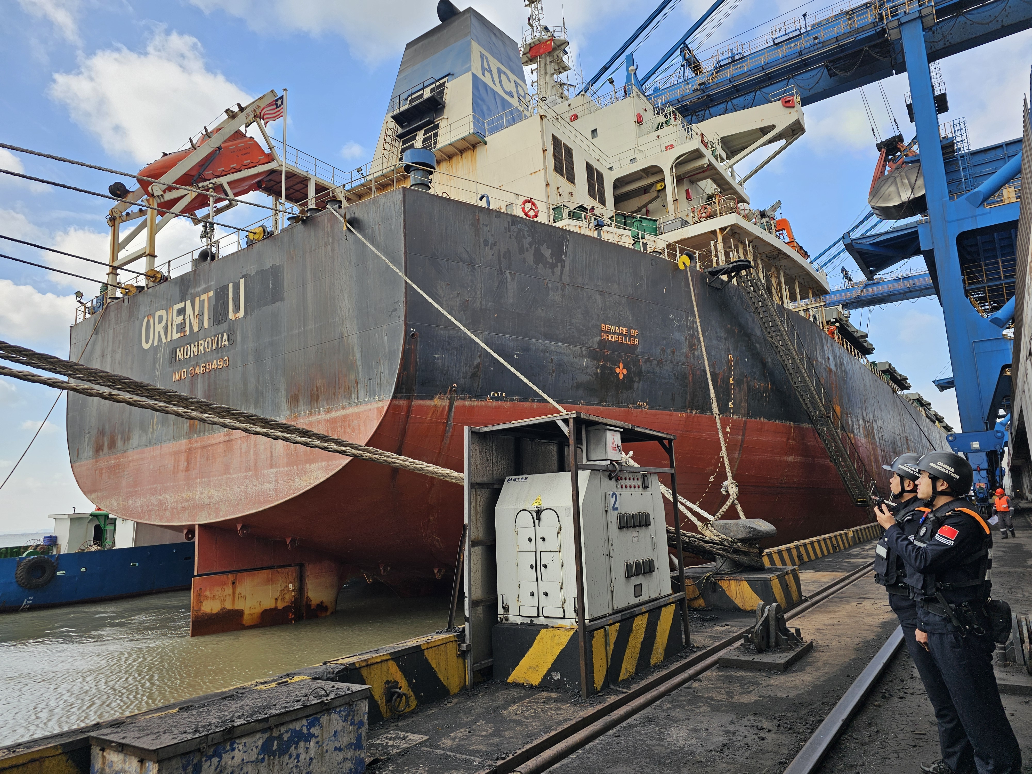 不远处的东1、东2泊位,利比里亚籍“东方联盟”轮与塞浦路斯籍“凯普罗斯”轮正加紧卸载15万吨煤炭。曾驻守云南边疆的移民管理警察蔡紫阳,如今守护着莆田口岸的滚滚货流。外轮梯口智能边检系统精准识别上下船人员,“一站式”线上申报让船舶实现“零等待”靠泊,这样的高效场景在莆田口岸迈向“亿吨大港”的奋进中已成为常态。