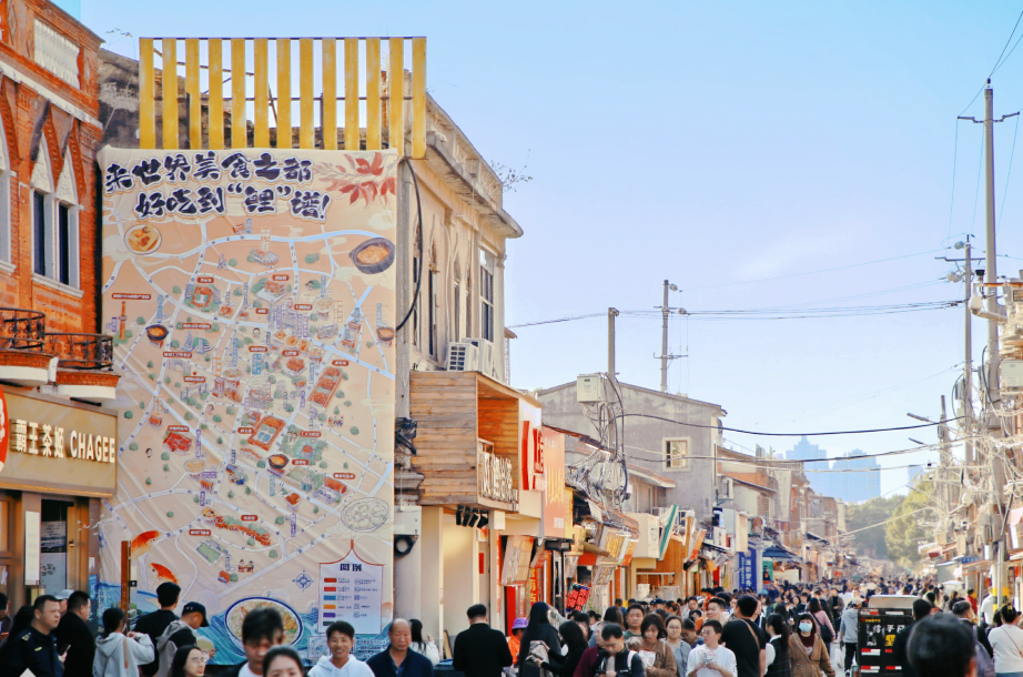 大型美食地图手绘海报悬挂在西街入口显眼位置
