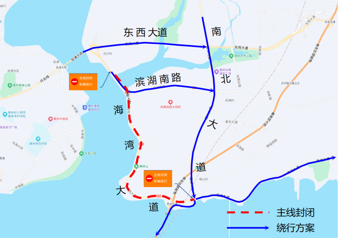 海湾大道北至白奇大桥北侧引桥起点,南至海湾大道与南北大道交叉口,主线进行全封闭施工,禁止车辆及行人通行(施工车辆除外)。