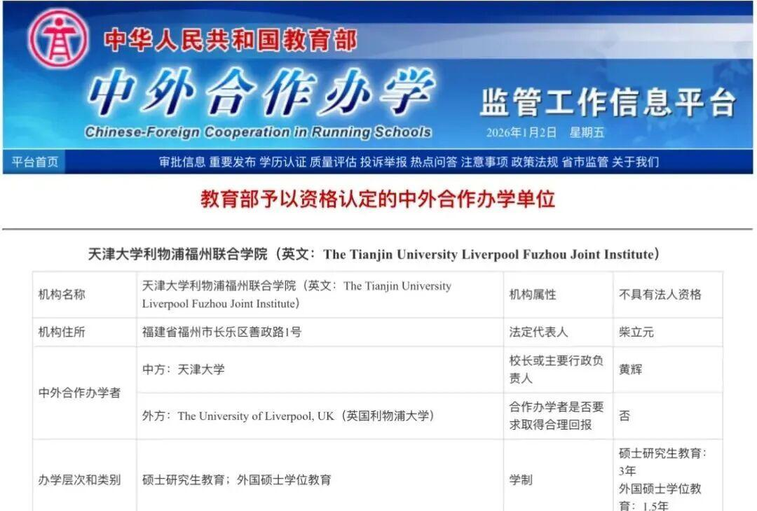 近日,教育部公布2025年下半年中外合作办学机构/项目评审结果,由天津大学与英国罗素大学集团创始成员利物浦大学合作举办的“天津大学利物浦福州联合学院”正式获批。该机构为非独立法人性质,落户福州长乐区,标志着福州落实教育对外开放战略取得重大突破。