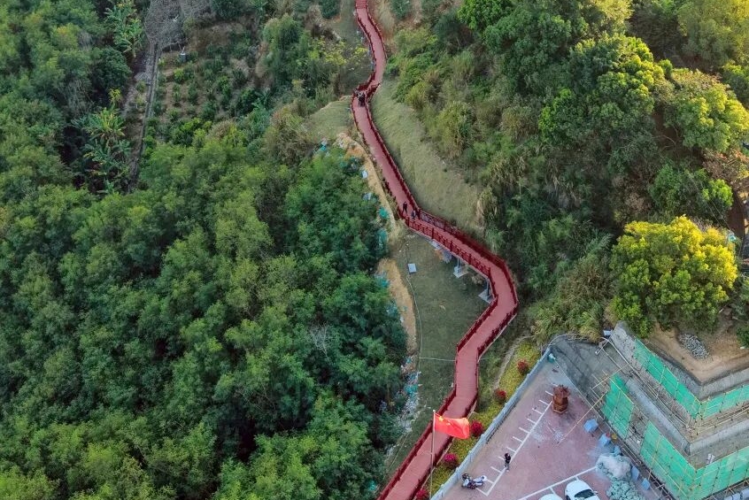 当天,工人们在福道入口处进行最后的检查与调试。全长420米的福道宛若一条红色丝带,从客山妈祖公园西广场一直延伸至文化长廊。步道宽1.8米,路面铺设环保舒适的微晶石仿木板,栏杆采用仿木铝合金材质,历经前段时间的降雨天气,依然光洁牢固。