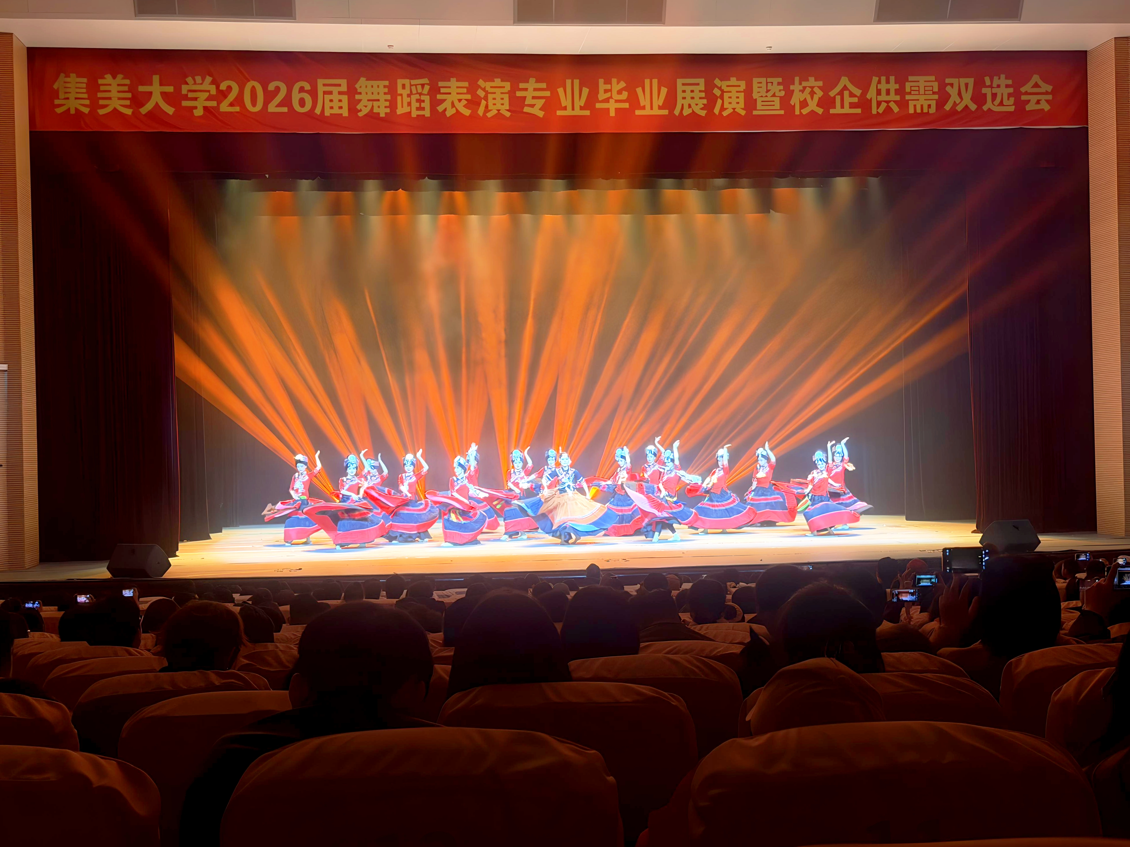 初始阶段为交流环节,毕业生与到场的20余家企业代表进行初步沟通。随后,现场转为绚丽的艺术舞台,2026届舞蹈表演专业本科毕业生为观众呈现了一场题为《霁华》的毕业汇演。