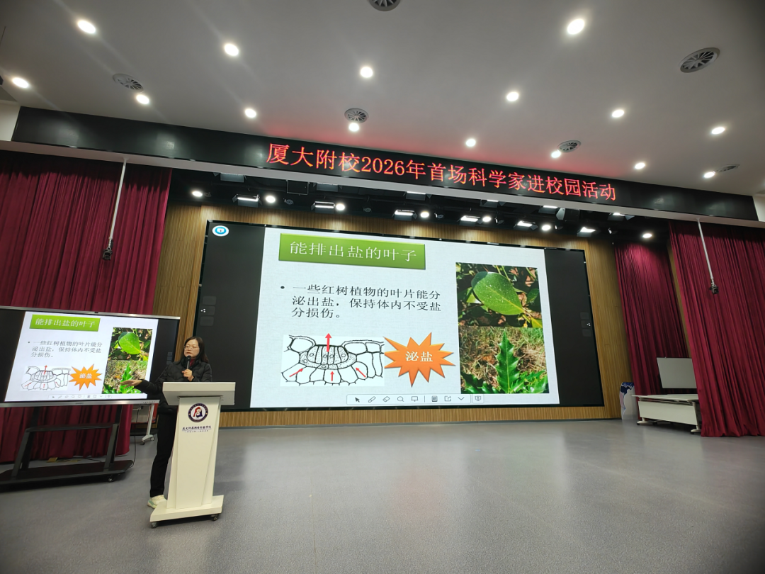 2026年1月5日下午,厦大附属翔安实验学校钟鸣厅内气氛热烈,掌声不断。2026年首场“科学家进校园”活动暨“思维大讲堂第二讲”红树林探秘专题讲座在此举行。全校300名学生代表与厦门大学环境与生态学院陈鹭真教授一同,开启了一场沉浸式的红树林科学探索之旅。厦门大学环境与生态学院工程师郑陈娟、附校校长刘杨、副校长李生华、课程发展中心主任魏燕妨共同出席了本次活动。