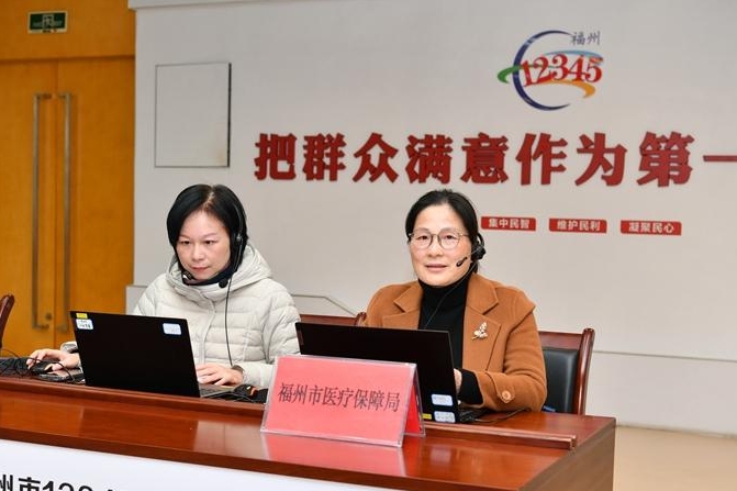 福州市医疗保障局局长叶玲(右一)接听12345热线。