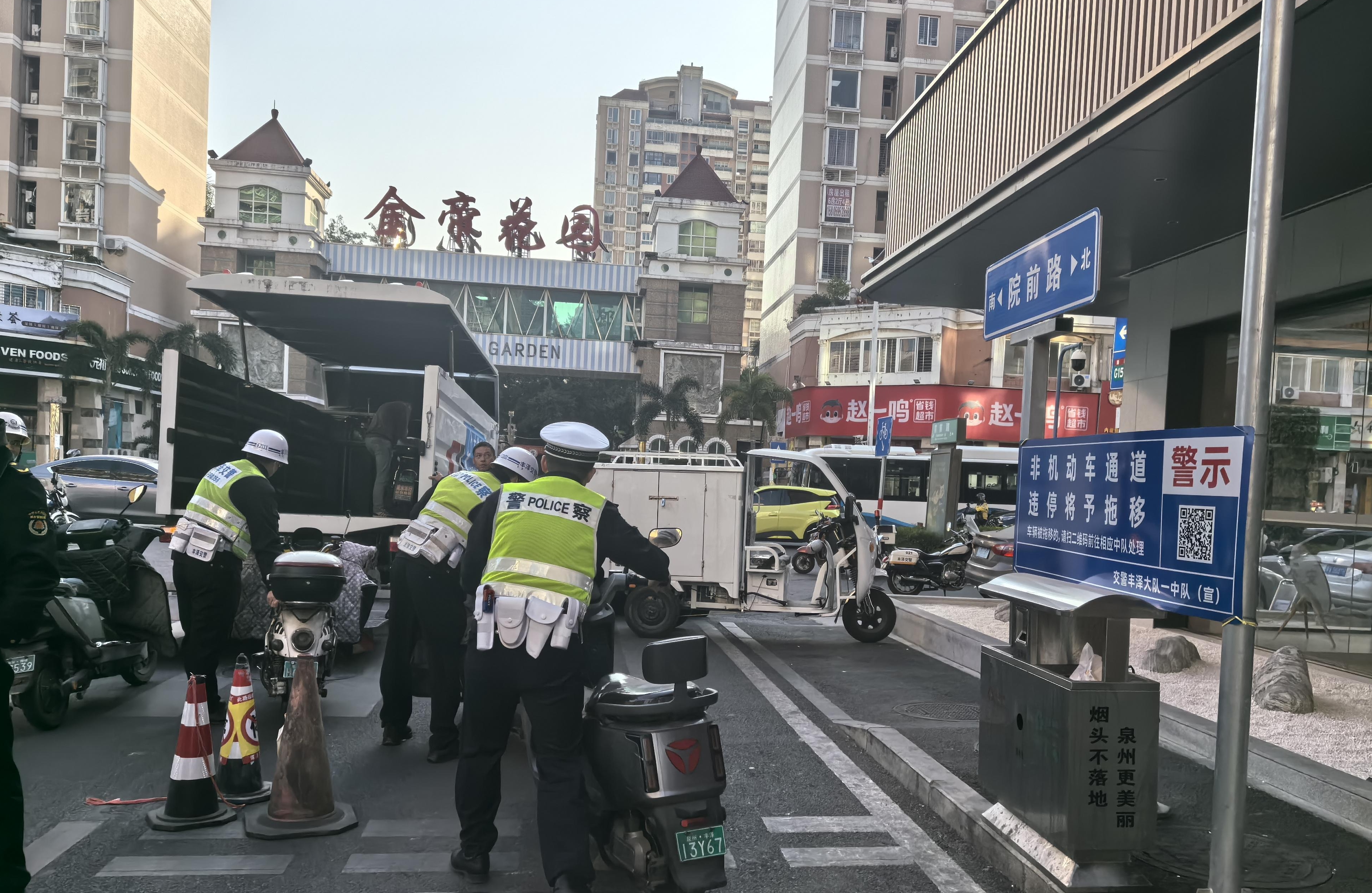 在院前路与泉秀街交叉路口处,丰泽交警大队一中队在院前路机动车道和泉秀街非机动车道上设置了多块醒目的警示牌,上面写着“非机动车通道违停将予拖移”的提示。“院前路的违停乱象是我们中队整治的重点之一,但这类违停随意性较强,多次整治后仍然容易出现回潮。”丰泽交警一中队民警告诉记者,随着该路段一家商业体开业后,非机动车的停车需求增大。交警协调后,商家设置了非机动车临时停车区域,并在道路上完善了相关指示标牌,但仍无法解决电动车乱停放问题。