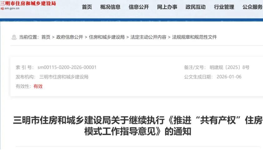 东南网1月10日讯 近日,三明市住建局网站发布关于继续执行《推进“共有产权”住房模式工作指导意见》的通知,该政策有效期由2025年12月31日延长至2026年12月31日。 各县(市、区)住建局,将乐县、泰宁县城建和交通局: 为进一步推动房地产市场平稳健康发展,经市政府同意,现就《推进“共有产权”住房模式工作指导意见》(明建〔2025〕4号)有关事项通知如下: 一、将第二条第一点“2025年年内有意在我市购买新建商品住房的家庭或个人”修改为“有意在我市购买新建商品住房的家庭或个人”。 二、延长《推进“共有产权”住房模式工作指导意见》(明建〔2025〕4号)有效期至2026年12月31日止。 三明市住房和城乡建设局 2025年12月31日 |