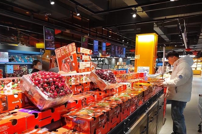9日,在西二环路的一家精品水果店,智利车厘子被摆放在醒目的位置。“单J级半公斤不到20元,2J级半公斤20多元,3J级半公斤30多元。”水果店老板郭先生介绍,“和2024年年底相比,价格降了超三成。”