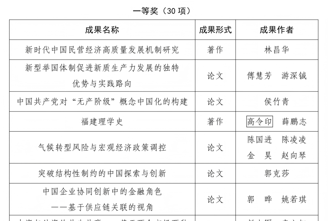 根据《福建省社会科学优秀成果奖励办法》,经研究,决定授予《新时代中国民营经济高质量发展机制研究》等30项成果福建省第十六届社会科学优秀成果一等奖,《国家治理现代化中的社会协商治理研究》等70项成果福建省第十六届社会科学优秀成果二等奖,《“新的文化生命体”的历史唯物主义内涵》等150项成果福建省第十六届社会科学优秀成果三等奖,《数字技术赋能生态文明建设:理论基础、作用机理与实现路径》等30项成果福建省第十六届社会科学优秀成果青年佳作奖。