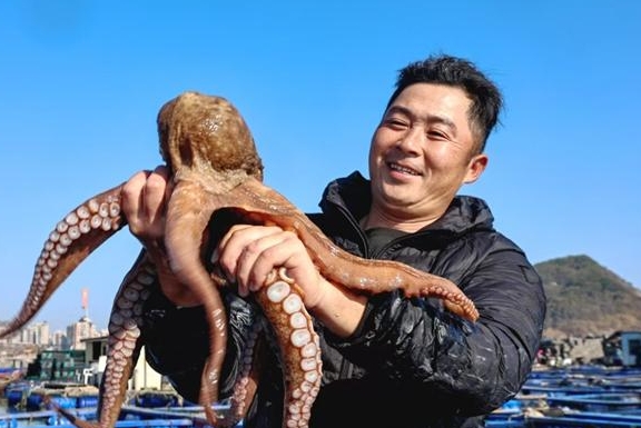 渔民展示刚捕捞上来的章鱼。(连江县融媒体中心供图)