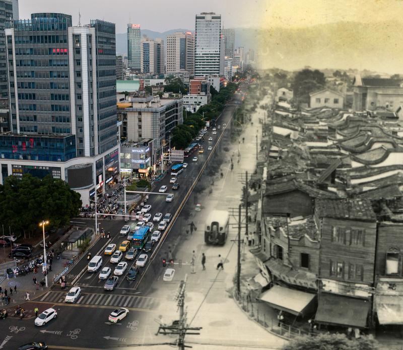 从百货商店到东百中心,从“第一高楼”到高楼林立,从环形人行天桥到地下过街网络,东街口诸多地标的变迁,见证了榕城一步步迈向现代化都市的历程。